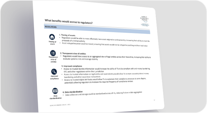 87 WORLD ECONOMIC FORUM | 2016 REGULATORSWhat benefits would accrue to regulators? Transparent view of entities 2. Transparent view of entities •Regulators would have access to an aggregated view of legal entities across their hierarchies, increasing their ability to evaluate systemic risk and manage stability Improved compliance 3. Improved compliance •Access to trusted identity information would increase the ability of FIs to be compliant with anti‐money laundering, KYC and other regulations within their jurisdiction •Access to trusted information on legal entity and asset identity would allow FIs to more accurately detect money laundering and other suspicious transactions•Access to trusted digital attributes would allow FIs to automate their compliance processes to some degree, potentially allowing regulators to increase the required frequency of compliance reviews Data standardisation 4. Data standardisation •Data collection and storage could be standardised across all FIs, reducing friction in data aggregation 1. Tra c ing of assets •Regulators would be able to more effectively trace asset origination and ownership, increasing their ability to track the proceeds of criminal activity •Asset rehypothecation could be traced, ensuring that assets would not be rehypothecated beyond their total value Tracing of assets