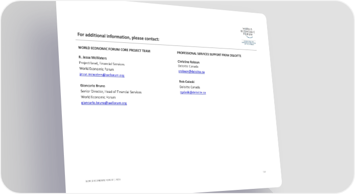 For additional information, please contact:WORLD ECONOMIC FORUM CORE PROJECT TEAM R. Jesse McWaters Project Lead, Financial Services World Economic Forum jesse.mcwaters@weforum.orgGiancarlo Bruno Senior Director, Head of Financial Services World Economic Forum giancarlo.bruno@weforum.org PROFESSIONAL SERVICES SUPPORT FROM DELOITTE Christine Robson Deloitte Canada crobson@deloitte.caRob Galaski Deloitte Canada rgalaski@deloitte.ca 107 WORLD ECONOMIC FORUM | 2016