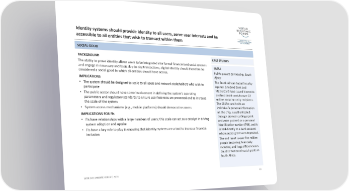 Identity systems should provide identity to all users, serve user interests and be accessible to all entities that wish to transact within themBACKGROUND The ability to prove identity allows users to be integrated into formal financial and social systems and engage in necessary and basic day‐to‐day transactions; digital identity should therefore be considered a social good to which all entities should have access. IMPLICATIONS •The system should be designed to scale to all users and network stakeholders who wish to participate •The public sector should have some involvement in defining the system’s operating parameters and regulatory standards to ensure user interests are protected and to increase the scale of the system •System access mechanisms (e.g., mobile platforms) should democratise access IMPLICATIONS FOR FIs •FIs have relationships with a large numbers of users; this scale can act as a catalyst in driving system adoption and uptake •FIs have a key role to play in ensuring that identity systems are a tool to increase financial inclusion 68 SASSA Public‐private partnership, South Africa The South African Social Security Agency, Grindrod Bank and MasterCard have issued biometric enabled debit cards to over 22 million social security recipients. The SASSA card holds an individual’s personal information on the chip, is authenticated through biometrics (fingerprint and voice pattern) or a personal identification number (PIN), and is linked directly to a bank account where social grants are deposited. The end result is over five million people becoming financially included, and huge efficiencies in the distribution of social grants in South Africa. WORLD ECONOMIC FORUM | 2016SOCIAL GOOD CASE STUDIES