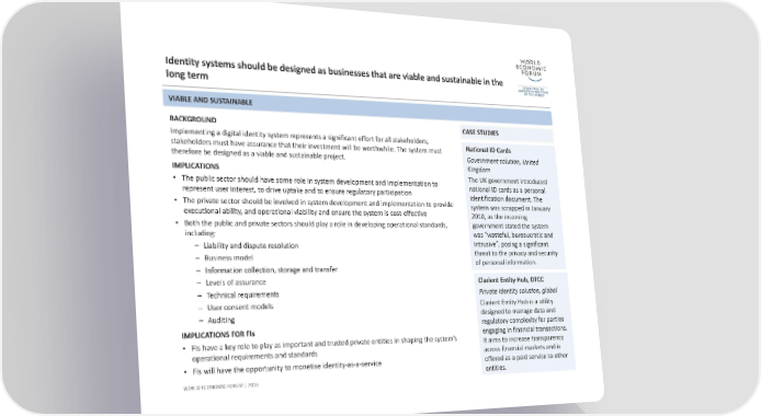Identity systems should be designed as businesses that are viable and sustainable in the long termBACKGROUND Implementing a digital identity system represents a significant effort for all stakeholders; stakeholders must have assurance that their investment will be worthwhile. The system must therefore be designed as a viable and sustainable project. IMPLICATIONS •The public sector should have some role in system development and implementation to represent user interest, to drive uptake and to ensure regulatory participation •The private sector should be involved in system development and implementation to provide executional ability, and operational viability and ensure the system is cost‐effective •Both the public and private sectors should play a role in developing operational standards, including: – Liability and dispute resolution –Business model – Information collection, storage and transfer –Levels of assurance – Technical requirements –User consent models – Auditing IMPLICATIONS FOR FIs •FIs have a key role to play as important and trusted private entities in shaping the system’s operational requirements and standards •FIs will have the opportunity to monetise identity‐as‐a‐service 71 WORLD ECONOMIC FORUM | 2016 VIABLE AND SUSTAINABLE CASE STUDIESNational ID Cards Government solution, United Kingdom The UK government introduced national ID cards as a personal identification document. The system was scrapped in January 2010, as the incoming government stated the system was “wasteful, bureaucratic and intrusive”, posing a significant threat to the privacy and security of personal information.Clarient Entity Hub, DTCC Private identity solution, global Clarient Entity Hub is a utility designed to manage data and regulatory complexity for parties engaging in financial transactions. It aims to increase transparency across financial markets and is offered as a paid service to other entities.