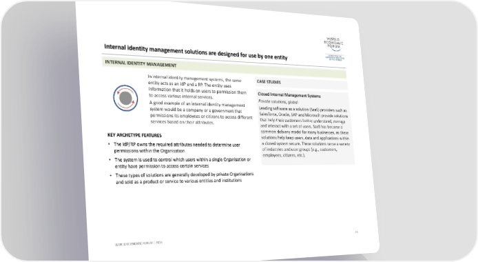 Internal identity management solutions are designed for use by one entity 55 WORLD ECONOMIC FORUM | 2016 KEY ARCHETYPE FEATURES •The IdP/RP owns the required attributes needed to determine user permissions within the Organisation •The system is used to control which users within a single Organisation or entity have permission to access certain services •These types of solutions are generally developed by private Organisations and sold as a product or service to various entities and institutions In internal identity management systems, the same entity acts as an IdP and a RP. The entity uses information that it holds on users to permission them to access various internal services. A good example of an internal identity management system would be a company or a government that permissions its employees or citizens to access different services based on their attributes. Closed Internal Management Systems Private solutions, global Leading software as a solution (SaaS) providers such as Salesforce, Oracle, SAP and Microsoft provide solutions that help their customers better understand, manage and interact with a set of users. SaaS has become a common delivery model for many businesses, as these solutions help keep users, data and applications within a closed system secure. These solutions serve a variety of industries and user groups (e.g., customers, employees, citizens, etc.). INTERNAL IDENTITY MANAGEMENT CASE STUDIES