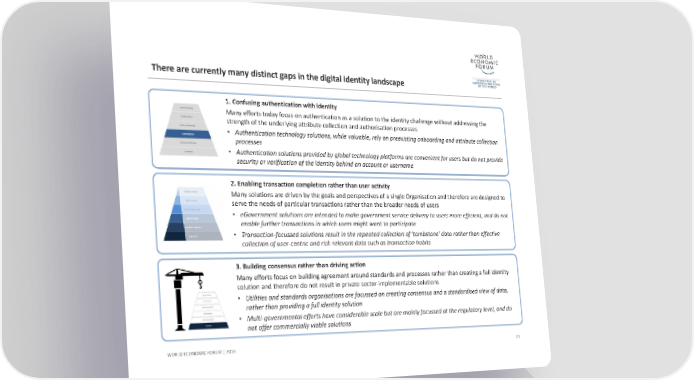 There are currently many distinct gaps in the digital identity landscape 20 WORLD ECONOMIC FORUM | 2016 2. Enabling transaction completion rather than user activity Many solutions are driven by the goals and perspectives of a single Organisation and therefore are designed to serve the needs of particular transactions rather than the broader needs of users •eGovernment solutions are intended to make government service delivery to users more efficient, and do not enable further transactions in which users might want to participate •Transaction‐focussed solutions result in the repeated collection of ‘tombstone’ data rather than effective collection of user‐centric and risk‐relevant data such as transaction habits 1. Confusing authentication with identity Many efforts today focus on authentication as a solution to the identity challenge without addressing the strength of the underlying attribute collection and authorisation processes •Authentication technology solutions, while valuable, rely on preexisting onboarding and attribute collection processes •Authentication solutions provided by global technology platforms are convenient for users but do not provide security or verification of the identity behind an account or username 3. Building consensus rather than driving action Many efforts focus on building agreement around standards and processes rather than creating a full identity solution and therefore do not result in private sector‐implementable solutions •Utilities and standards organisations are focussed on creating consensus and a standardised view of data, rather than providing a full identity solution •Multi‐governmental efforts have considerable scale but are mainly focussed at the regulatory level, and do not offer commercially viable solutions