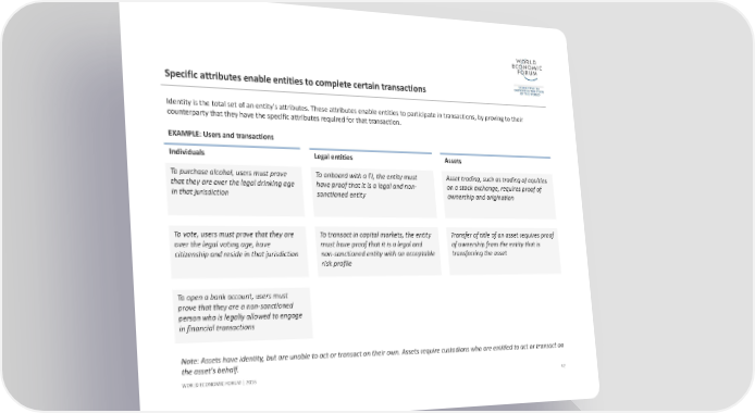 Specific attributes enable entities to complete certain transactionsIndividuals 42 Legal entities Assets WORLD ECONOMIC FORUM | 2016Identity is the total set of an entity’s attributes. These attributes enable entities to participate in transactions, by proving to their counterparty that they have the specific attributes required for that transaction. To purchase alcohol, users must prove that they are over the legal drinking age in that jurisdictionTo vote, users must prove that they are over the legal voting age, have citizenship and reside in that jurisdictionTo open a bank account, users must prove that they are a non‐sanctioned person who is legally allowed to engage in financial transactions To onboard with a FI, the entity must have proof that it is a legal and non‐ sanctioned entityTo transact in capital markets, the entity must have proof that it is a legal and non‐sanctioned entity with an acceptable risk profile Asset trading, such as trading of equities on a stock exchange, requires proof of ownership and originationTransfer of title of an asset requires proof of ownership from the entity that is transferring the asset EXAMPLE: Users and transactionsNote: Assets have identity, but are unable to act or transact on their own. Assets require custodians who are entitled to act or transact on the asset's behalf.