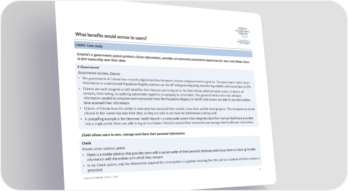 E‐Government Government solution, Estonia •The government of Estonia has created a digital interface between citizens and government agencies. The government holds citizen information in a centralised Population Registry and acts as the IdP and governing body, transferring reliable and trusted data to RPs. •Citizens are each assigned an eID identifier that they can use to log on to the State Portal, which provides access to dozens of services, from voting, to updating automobile registries, to applying to universities. The government transfers the attribute information needed to complete each transaction from the Population Registry to the RP, and citizens are able to see what entities have accessed their information. •Citizens of Estonia have the ability to view who has accessed their records, how often and for what purpose. This transparency allows citizens to feel ownership over their data, as they are able to see how the information is being used. •A compelling example is the Electronic Health Record –a nationwide system that integrates data from various healthcare providers into a single portal. Users are able to log on to a Patient Portal to control their treatment and manage their healthcare information. 79 WORLD ECONOMIC FORUM | 2016 USERS: Case studyWhat benefits would accrue to users?Estonia’s e‐government system protects citizen information, provides an extremely convenient experience for users and allows them to feel ownership over their data. Chekk Private sector solution, global •Chekk is a mobile solution that provides users with a secure wallet of their personal attributes and allows them to share up‐to‐date information with the entities with which they transact. •In the Chekk system, only the information required for a transaction is supplied, meaning that the user is in control and their privacy is protected. Chekk allows users to own, manage and share their personal information