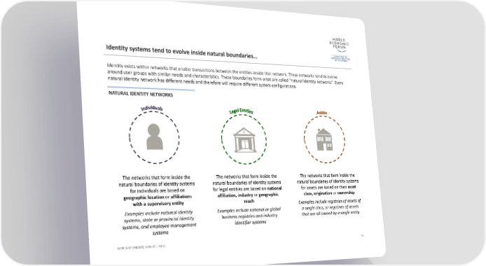 Identity systems tend to evolve inside natural boundaries…Identity exists within networks that enable transactions between the entities inside that network. These networks tend to evolve around user groups with similar needs and characteristics. These boundaries form what are called “natural identity networks”. Every natural identity network has different needs and therefore will require different system configurations. NATURAL IDENTITY NETWORKS 45 WORLD ECONOMIC FORUM | 2016 The networks that form inside the natural boundaries of identity systems for individuals are based on geographic location oraffiliations with a supervisory entity Examples include national identity systems, state or provincial identity systems, and employee management systems The networks that form inside the natural boundaries of identity systems for legal entities are based on national affiliation, industryor geographic reach Examples include national or global business registries and industry identifier systems The networks that form inside the natural boundaries of identity systems for assets are based on their asset class, origination or ownership Examples include registries of assets of a single class, or registries of assets that are all owned by a single entity