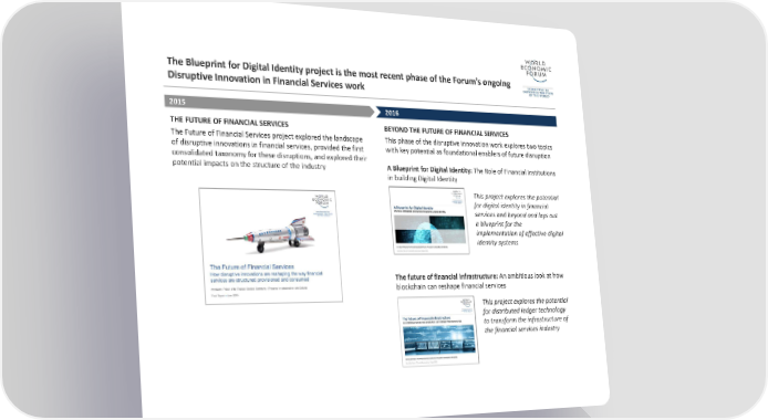 The Blueprint for Digital Identity project is the most recent phase of the Forum’s ongoing Disruptive Innovation in Financial Services workTHE FUTURE OF FINANCIAL SERVICES The Future of Financial Services project explored the landscape of disruptive innovations in financial services, provided the first consolidated taxonomy for these disruptions, and explored their potential impacts on the structure of the industryBEYOND THE FUTURE OF FINANCIAL SERVICES This phase of the disruptive innovation work explores two topics with key potential as foundational enablers of future disruption 2015 2016 This project explores the potential for digital identity in financial services and beyond and lays out a blueprint for the implementation of effective digital identity systems A Blueprint for Digital Identity: The Role of Financial Institutions in building Digital IdentityThis project explores the potential for distributed ledger technology to transform the infrastructure of the financial services industry The future of financial infrastructure: An ambitious look at how blockchain can reshape financial services