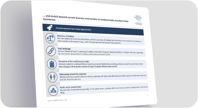 Transformational Future State Opportunities … and stretch beyond current business and markets to fundamentally transform their businesses 27 WORLD ECONOMIC FORUM | 2016 Trust brokerage Act as a ‘broker of trust’ in previously trustless interactions between disparate parties in multiple industries, expanding the reach of FIs beyond the FS industry and reaching new profit poolsDisruption of the credit bureau model Evaluate customer creditworthiness based on accurate identity data including preferences and financial history rather than relying on third parties and the mining of multiple different data sourcesRefocussing around the customer Refocus business around customer service, assisting with day‐to‐day decisioning and blurring the lines between financial and non‐financial advisoryPublic sector partnerships Become the trusted identity provider of the public sector, assisting with social services and civic requirements such as tax filingAllocation of liability Shift the liability for incorrect information, and the outcomes of holding this information, from Financial Institutions to other entities in the network (e.g., users through approval and consent requirements)