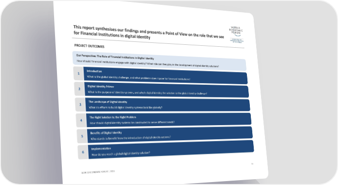 This report synthesises our findings and presents a Point of View on the role that we see for Financial Institutions in digital identityPROJECT OUTCOMES 13 WORLD ECONOMIC FORUM | 2016 Our Perspective: The Role of Financial Institutions in Digital Identity How should Financial Institutions engage with digital identity? What role can they play in the development of digital identity solutions? Introduction What is the global identity challenge, and what problems does it pose for Financial Institutions? 1 Digital Identity Primer What is the purpose of identity systems, and why is digital identity the solution to the global identity challenge? 2 The Landscape of Digital Identity What do efforts to build digital identity systems look like globally? 3 The Right Solution to the Right Problem How should digital identity systems be constructed to serve different needs? 4 Benefits of Digital Identity Who stands to benefit from the introduction of digital identity systems? 5 Implementation How do you reach a global digital identity solution? 6