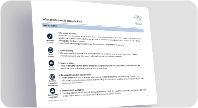 What benefits would accrue to RPs? 82 WORLD ECONOMIC FORUM | 2016 RELYING PA R T I E S Service tailoring 2. Service tailoring •RPs would be able to provide more tailored products and services to users by requesting access to identity information beyond what they would traditionally require to complete transactions Service provision 3. Service provision •More reliable and accurate identity protocols would give RPs greater ability to differentiate between illicit and legitimate users, and to deny or provide services accordingly Decreased transaction abandonment 4. Decreased transaction abandonment •A more streamlined user experience would remove barriers to completing transactions (e.g., forgotten login information, required account creation, rejected billing information) and would therefore reduce the rates of users’ transaction abandonment Decreased risk and liability 5. Decreased risk and liability •Liability guidelines would be clearly defined and communicated; RPs would be clear about their liability in the event of data loss or breach, or contravention of the standards for identity provision 1. Information accuracy •RPs would have access to trusted, verified identity information matched to the level of assurance required for their products or services; this would eliminate the need for information remediation and for information cross‐checks through paid third‐party services •Digital attribute exchange would eliminate the potential for human error in transactions Information accuracy