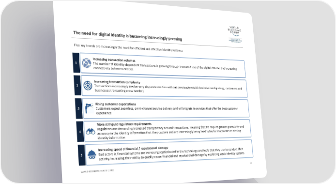 Increasing transaction volumes The number of identity‐dependent transactions is growing through increased use of the digital channel and increasing connectivity between entitiesIncreasing transaction complexity Tra n s a c t i o n s increasingly involve very disparate entities without previously established relationships (e.g., customers and businesses transacting cross‐border) The need for digital identity is becoming increasingly pressing 18 WORLD ECONOMIC FORUM | 2016 Five key trends are increasingly the need for efficient and effective identity systems:1234 Rising customer expectations Customers expect seamless, omni‐channel service delivery and will migrate to services that offer the best customer experienceMore stringent regulatory requirements Regulators are demanding increased transparency around transactions, meaning that FIs require greater granularity and accuracy in the identity information that they capture and are increasingly being held liable for inaccurate or missing identity information 5 Increasing speed of financial / reputational damage Bad actors in financial systems are increasing sophisticated in the technology and tools that they use to conduct illicit activity, increasing their ability to quickly cause financial and reputational damage by exploiting weak identity systems