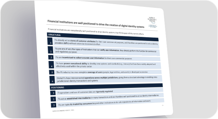 Financial Institutions are well positioned to drive the creation of digital identity systemsFinancial institutions are exceptionally well positioned to drive identity systems that fill the gaps left by current efforts 23 WORLD ECONOMIC FORUM | 2016 FIs already act as stores of customer attributes for their own commercial purposes, and therefore are positioned to act as identity providers (IdPs) without extensive incremental effort 1 FIs are one of very few types of institutions that can verify user information; they already perform this function for commercial and regulatory purposes 2 FIs are typically trusted by consumers beyond other institutions to be safe repositories of information and assets 3 FIs are incentivised to collect accurate user informationfor their own commercial purposes 3 FI operations and use of customer data are rigorously regulated 1 FIs have proven executional abilityto develop new systems and standards (e.g., Interac) that have been widely adopted and effectively used within the private sector 4 FIs act as established intermediaries in many transactions and are therefore well positioned to act as identity intermediaries 2 The FS industry has near‐complete coverage of users (people, legal entities, and assets) in developed economies 5 Global FIs have interconnected operations across multiple jurisdictions, giving them a structural advantage in enabling cross‐ jurisdictional identity transactions and systems 6STRUCTURALPOSITIONING