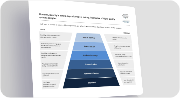 However, identity is a multi‐layered problem making the creation of digital identity systems complexEach layer of identity of serves a different purpose, and suffers from a distinct set of problems in today’s identity landscape Service DeliveryAuthorisation Attribute Exchange Authentication Attribute Collection Standards Providing efficient, effective and seamless services to usersProvisioning what services users are entitled to access based on their attributesProviding mechanisms for exchanging attributes between partiesProviding mechanisms for linking users to attributesCapturing and storing user attributesDeveloping standards to govern system operationGOALS Inefficient or unsuited service deliveryComplex authorisation rules and relationshipsInsecure and privacy‐ compromising attribute exchange Weak or inconvenient authentication Inaccurate or insufficient attribute collection Lack of coordination and consistency PROBLEMS