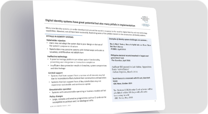 Digital identity systems have great potential but also many pitfalls in implementationPITFALLS IN IDENTITY SYSTEMS Stakeholder rejection •Users may not adopt the system due to poor design or distrust of the system’s purpose or structure •Stakeholders may perceive systems with limited scope and scale as valueless, and therefore not adopt them Ineffective technology •A poor technology platform can reduce system functionality, preventing user integration or transaction completion •Insufficient data protection results in breaches, system compromises and data leakage Limited support •Systems that have support from a narrow set of interests may fail due to inconsistent efforts behind their construction and operation •Systems that lack support from all key stakeholders may not experience sustainable and continuous uptake Unsustainable operation •Systems with unsustainable operating or business models will fail Policy changes •Large, complex and emotive programmes such as ID cards can be susceptible to political and / or ideological shifts Examples of identity system challenges are common… 38 WORLD ECONOMIC FORUM | 2016 Many new identity systems are under development around the world in response to the need for digital identity and new technology capabilities. However, not all have been successful, illustrating some of the pitfalls inherent in the construction of identity systems. South Korea at a crossroads with ID card, data theft losses ‐CBC News, October 2014 The National [UK] Identity Card scheme will be abolished within 100 days with all cards becoming invalid -BBC News, May 2010 Philippine electoral records breached in 'largest ever' government hack ‐The Guardian, April 2016 Hack Brief: Turkey Breach Spills Info on More Than Half Its Citizens -WIRED, April 2016 Aadhaar Bill passed in Lok Sabha, Opposition fears ‘surveillance’ -Indian Express, March 2016