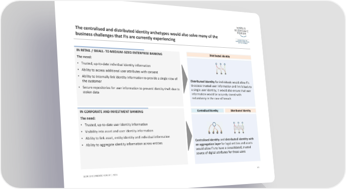 The centralised and distributed identity archetypes would also solve many of the business challenges that FIs are currently experiencing 64 WORLD ECONOMIC FORUM | 2016 IN RETAIL / SMALL‐TO MEDIUM‐SIZED ENTERPRISE BANKING The need: •Trusted, up‐to‐date individual identity information •Ability to access additional user attributes with consent •Ability to internally link identity information to provide a single view of the customer •Secure repositories for user information to prevent identity theft due to stolen data IN CORPORATE AND INVESTMENT BANKING The need: •Trusted, up‐to‐date user identity information •Visibility into asset and user identity information •Ability to link asset, entity identity and individual information •Ability to aggregate identity information across entities Distributed identity Distributed identityfor individuals would allow FIs to access trusted user information and link it back to a single user identity; it would also ensure that user information would be securely stored with redundancy in the case of breach Centralised identity Centralised identity and distributed identity with an aggregation layer for legal entities and assets would allow FIs to have a consolidated, trusted source of digital attributes for these users Distributed identity