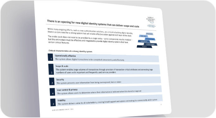 There is an opening for new digital identity systems that can deliver scope and scale While many ongoing efforts, such as new authentication solutions, are critical to building digital identity, there is a core need for a strong system that will enable effective action against each layer of the stack The entire stack does not need to be provided by a single entity –some components may be modular – but the entire stack must be effective and integrated to provide digital identity systems that have certain critical features 22 WORLD ECONOMIC FORUM | 2016 Operationally effective The system allows digital transactions to be completed conveniently and effectively 1 Scope & scale The system enables large volumes of transactions through provision of transaction‐critical attributes and connecting large numbers of users with important and frequently used service providers 2 Security The system prevents user information from being overexposed, lost or stolen 3 User control & privacy The system allows users to determine where their information is held and when it is shared or exposed 4 Viability The system delivers value to all stakeholders, creating broad support and uptake and making it a commercially viable system 5 Critical characteristics of a strong identity system Service Delivery Authorisation Attribute Exchange Authentication Attribute Collection Standards