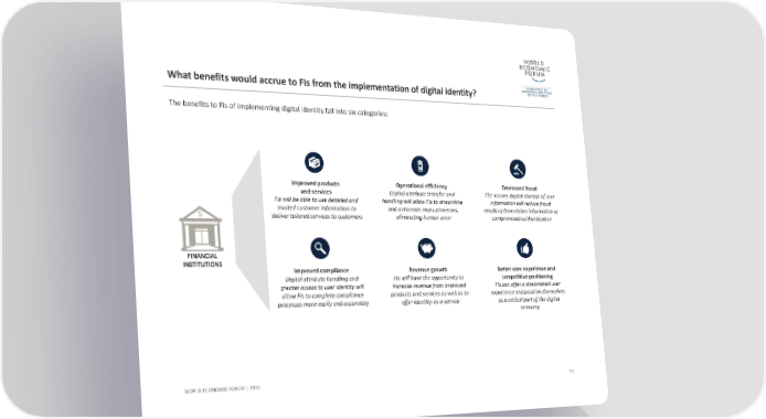 What benefits would accrue to FIs from the implementation of digital identity? The benefits to FIs of implementing digital identity fall into six categories: 90 WORLD ECONOMIC FORUM | 2016 Improved compliance Digital attribute handling and greater access to user identity will allow FIs to complete compliance processes more easily and accurately Revenue growth FIs will have the opportunity to increase revenue from improved products and services as well as to offer identity‐as‐a‐serviceBetter user experience and competitive positioning FIs can offer a streamlined user experience and position themselves as a critical part of the digital economy Decreased fraud The secure, digital storage of user information will reduce fraud resulting from stolen information or compromised authentication Operational efficiency Digital attribute transfer and handling will allow FIs to streamline and automate many processes, eliminating human error Improved products and services FIs will be able to use detailed and trusted customer information to deliver tailored services to customers FINANCIAL INSTITUTIONS