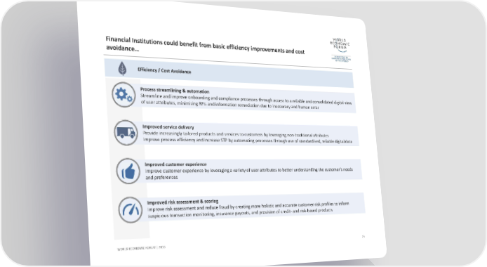 Efficiency / Cost Avoidance Financial Institutions could benefit from basic efficiency improvements and cost avoidance… 25 WORLD ECONOMIC FORUM | 2016 Process streamlining & automation Streamline and improve onboarding and compliance processes through access to a reliable and consolidated digital view of user attributes, minimising RFIs and information remediation due to inaccuracy and human errorImproved service delivery Provide increasingly tailored products and services to customers by leveraging non‐traditional attributes Improve process efficiency and increase STP by automating processes through use of standardised, reliable digital dataImproved customer experience Improve customer experience by leveraging a variety of user attributes to better understanding the customer’s needs and preferencesImproved risk assessment & scoring Improve risk assessment and reduce fraud by creating more holistic and accurate customer risk profiles to inform suspicious transaction monitoring, insurance payouts, and provision of credit‐and risk‐based products