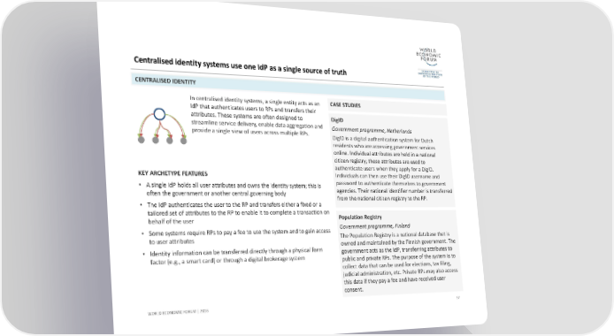 Centralised identity systems use one IdP as a single source of truth 57 WORLD ECONOMIC FORUM | 2016 KEY ARCHETYPE FEATURES •A single IdP holds all user attributes and owns the identity system; this is often the government or another central governing body •The IdP authenticates the user to the RP and transfers either a fixed or a tailored set of attributes to the RP to enable it to complete a transaction on behalf of the user •Some systems require RPs to pay a fee to use the system and to gain access to user attributes •Identity information can be transferred directly through a physical form factor (e.g., a smart card) or through a digital brokerage system In centralised identity systems, a single entity acts as an IdP that authenticates users to RPs and transfers their attributes. These systems are often designed to streamline service delivery, enable data aggregation and provide a single view of users across multiple RPs. DigID Government programme, Netherlands DigID is a digital authentication system for Dutch residents who are accessing government services online. Individual attributes are held in a national citizen registry; these attributes are used to authenticate users when they apply for a DigID. Individuals can then use their DigID username and password to authenticate themselves to government agencies. Their national identifier number is transferred from the national citizen registry to the RP. CENTRALISED IDENTITY CASE STUDIESPopulation Registry Government programme, Finland The Population Registry is a national database that is owned and maintained by the Finnish government. The government acts as the IdP, transferring attributes to public and private RPs. The purpose of the system is to collect data that can be used for elections, tax filing, judicial administration, etc. Private RPs may also access this data if they pay a fee and have received user consent.