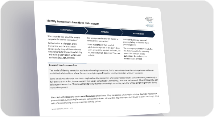 Identity transactions have three main aspects 43 WORLD ECONOMIC FORUM | 2016 Authorisation Attributes Authentication Can users prove that they are eligible to complete this transaction? Users must present their proof of attributes in response to the query. Once users present the required attributes, the counterparty must determine if they are reliable. Do the attributes being presented genuinely belong to the entity that is presenting them? The counterparty will determine whether the attributes match the presenting users. If the users are able to authenticate the attributes, the transaction can proceed. What must be true about the users to complete the desired transaction? Authorisation is a function of the transaction and the transaction counterparty; they will determine the requirements for transaction eligibility, and make a query about certain user attributes (e.g., age, address). Repeated identity transactions This model of identity transaction applies to onboarding transactions, that is, transactions where the counterparties do not have an established relationship or where the counterparty is required to gather identity information with every transaction. Some identity relationships may have a single onboarding transaction; after initially onboarding the users and verifying them through a full identity transaction, the counterparty may use an authentication method (e.g., username and password, chip‐and‐PIN card) for each subsequent transaction. This allows them to verify that the same entity is transacting each time without going through the full identity transaction process. Note: Not all transactions require exact knowledge of attributes. Many transactions simply require attribute data to fall inside certain parameters (e.g., instead of knowing an individual’s birthdate, a transaction may only require that the user be over a certain age); this is critical in constructing privacy‐enhancing identity systems.