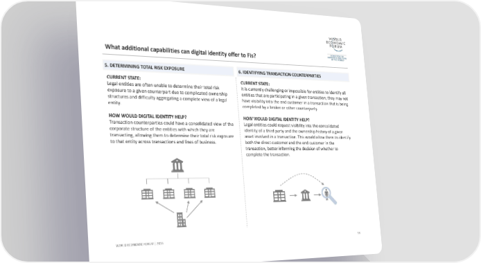 What additional capabilities can digital identity offer to FIs? CURRENT STATE: Legal entities are often unable to determine their total risk exposure to a given counterpart due to complicated ownership structures and difficulty aggregating a complete view of a legal entity. HOW WOULD DIGITAL IDENTITY HELP? Tra n s a c t i o n counterparties could have a consolidated view of the corporate structure of the entities with which they are transacting, allowing them to determine their total risk exposure to that entity across transactions and lines of business. 98 WORLD ECONOMIC FORUM | 2016 5. DETERMINING TOTAL RISK EXPOSURE CURRENT STATE: It is currently challenging or impossible for entities to identify all entities that are participating in a given transaction; they may not have visibility into the end customer in a transaction that is being completed by a broker or other counterparty. HOW WOULD DIGITAL IDENTITY HELP? Legal entities could request visibility into the consolidated identity of a third party and the ownership history of a given asset involved in a transaction. This would allow them to identify both the direct customer and the end customer in the transaction, better informing the decision of whether to complete the transaction. 6. IDENTIFYING TRANSACTION COUNTERPARTIES