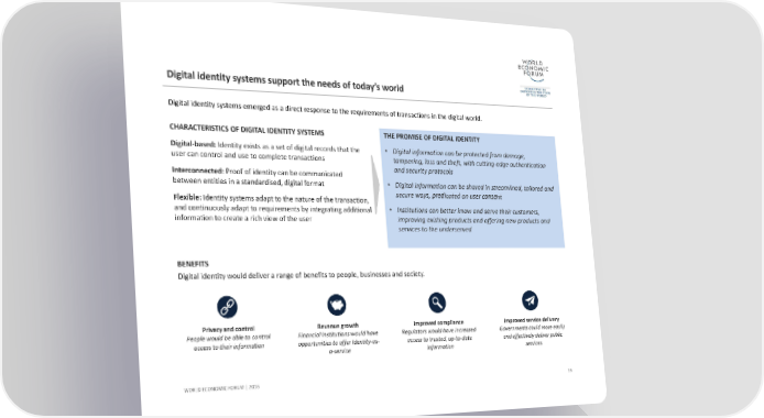 Digital identity systems support the needs of today’s worldCHARACTERISTICS OF DIGITAL IDENTITY SYSTEMS Digital‐based: Identity exists as a set of digital records that the user can control and use to complete transactions Interconnected: Proof of identity can be communicated between entities in a standardised, digital format Flexible: Identity systems adapt to the nature of the transaction, and continuously adapt to requirements by integrating additional information to create a rich view of the user THE PROMISE OF DIGITAL IDENTITY •Digital information can be protected from damage, tampering, loss and theft, with cutting‐edge authentication and security protocols •Digital information can be shared in streamlined, tailored and secure ways, predicated on user consent •Institutions can better know and serve their customers, improving existing products and offering new products and services to the underserved 36 WORLD ECONOMIC FORUM | 2016 BENEFITS Digital identity would deliver a range of benefits to people, businesses and society. Digital identity systems emerged as a direct response to the requirements of transactions in the digital world. Revenue growth Financial Institutions would have opportunities to offer Identity‐as‐ a‐service Privacy and control People would be able to control access to their information Improved compliance Regulators would have increased access to trusted, up‐to‐date informationImproved service delivery Governments could more easily and effectively deliver public services