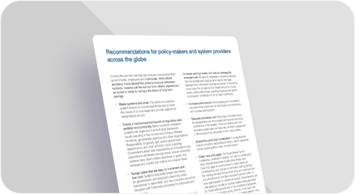 Recommendations for policy-makers and system providers across the globe Closing the pension savings gap requires cooperation from – Increase savings levels and reduce leakage for governments, employers and individuals. While efforts emergencies: Access to separate emergency savings are being made around the globe to improve retirement can encourage participation and help to manage systems, lessons can be learned from others’ experiences leakage from retirement savings accounts. It should be as action is taken to reshape the future of long-term made easy for private-sector organizations to create savings. plans, particularly those allowing employers to match employees’ contributions (or at least contribute). – Make systems inclusive: The pillars of a pension system should be coordinated holistically to meet – Increase participation: Encouraging auto-enrolment the needs of all individuals and provide support for and providing incentives for individuals and employers marginalized groups. will increase participation. – Create a harmonized framework of regulation and – Educate and reach out: Educating individuals about political accountability: Many countries’ retirement the programme will encourage participation and build systems are organized in a multi-pillar framework, confidence in the system. Also connecting with and usually resulting in the involvement of many different educating employers will help secure their engagement ministries, government agencies and other organizations. in the programme, especially in the rollout phase. Responsibility is typically split across government departments, and often a holistic vision is lacking. – Guarantee participant protection: It is important to Governments must take responsibility to understand their ensure providers and products meet a set of standards population’s retirement savings needs, ensure retirement before allowing them entry into the market. systems have clearly stated objectives or goals, and measure and monitor the metrics on a regular basis. – Close inequality gaps: The focus should be on increasing contribution density, not just on contribution – Design plans that are easy to implement and rates. System providers should allow those who low cost: Systems should be simple and cheap have had gaps in contributions to make catch-up for governments and employers (especially small contributions, and reduce or eliminate vesting periods, businesses) to implement, and low-cost plans should be the waiting periods during which they are employed but designed with frictionless processes for employers and not yet allowed to join the employer’s pension plan, to employees. allow participants to contribute sooner. Governments can offer pension credits or income replacement payments – Invest in digital transformation: Governments should for those with periods out of the workforce (caregivers, invest in digital transformation to provide an infrastructure the disabled, parents raising children, individuals who that is accessible and affordable to promote digital experienced periods of sickness or unemployment, etc.). financial services among underserved populations. – Ensure portability: Accounts should be portable across employers/regions where possible; portability is particularly important in developing countries with large informal labour markets. How We Can Save (for) Our Future 17