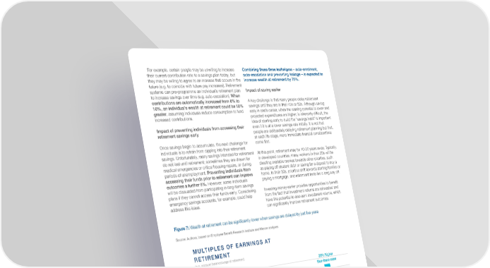 For example, certain people may be unwilling to increase Combining these three techniques – auto-enrolment, their current contribution rate to a savings plan today, but auto-escalation and preventing leakage – is expected to they may be willing to agree to an increase that occurs in the increase wealth at retirement by 70%. future (e.g. to coincide with future pay increases). Retirement systems can pre-programme an individual’s retirement plan Impact of saving earlier to increase savings over time (e.g. auto-escalation). When contributions are automatically increased from 6% to A key challenge is that many people delay retirement 10%, an individual’s wealth at retirement could be 18% savings until they are in their 40s or 50s. Although saving greater, assuming individuals reduce consumption to fund early in one’s career, when the earning potential is lower and increased contributions. projected expenditures are higher, is inherently difficult, the idea of starting early to build the “savings habit” is important Impact of preventing individuals from accessing their even if it is at a lower savings rate initially. It is not that retirement savings early people are deliberately delaying retirement planning but that, at each life stage, more immediate financial considerations Once savings begin to accumulate, the next challenge for come first. individuals is to refrain from dipping into their retirement savings. Unfortunately, many savings intended for retirement At this point, retirement may be 10-20 years away. Typically, do not last until retirement; sometimes they are drawn for in developed countries, many workers in their 20s will be medical emergencies or critical housing repairs, or during directing available monies towards other priorities, such periods of unemployment. Preventing individuals from as paying off student debt or saving for a deposit to buy a accessing their funds prior to retirement can improve home. In their 30s, priorities shift towards starting families or outcomes a further 9%. However, some individuals paying a mortgage, and retirement feels like a long way off. will be dissuaded from participating in long-term savings plans if they cannot access their funds early. Considering Investing money earlier provides opportunities to benefit emergency savings accounts, for example, could help from the fact that investment returns are reinvested and address this issue. have the potential to also earn investment returns, which can significantly improve retirement outcomes. Figure 7: Wealth at retirement can be significantly lower when savings are delayed by just five years Source: Authors, based on Employee Benefit Research Institute and Mercer analyses MULTIPLES OF EARNINGS AT RETIREMENT (e.g. account balance/wage at retirement) 6 26% higher than base case 5 18% lower 4 than base case 3 50% lower than base case 2 1 0 Base case Impact of delaying Impact of delaying Impact of working saving 5 years saving significantly 5 years longer Contributes 6% Contributes 6% Contributes 6% Contributes 6% p.a. from age p.a. from age p.a. from age p.a. from age 27 to age 65 40 to age 65 22 to age 70 22 to age 65 How We Can Save (for) Our Future 13