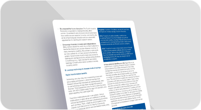 – Be prepared for future disruption: The Fourth Industrial Progress: A number of initiatives over recent years have Revolution is expected to disproportionately affect attempted to increase savings rates for Mexicans. women. Governments and employers should understand how workforces are expected to evolve, and identify jobs 2015: Possibility to make voluntary contributions at risk of technological disruption and any associated to existing Pension Fund Administrator accounts at opportunities for reskilling and adjacent careers. common retail outlets, including 7-Eleven stores, as well – Encourage financial inclusion and independence: as branches of a development bank and a state-owned Many women around the world rely on their husbands to telecommunications and financial services company handle the finances and provide retirement incomes. In 2016: Possibility to open a basic bank account through many developing countries, the problem is more acute a mobile phone payment platform with only a mobile as many women do not have access to the financial phone number, and to make deposits in a Pension system. Governments should ensure easy access to Fund Administrator account by sending an SMS (short banking and savings products, perhaps using advances messaging service). No fees are charged and no in technology (e.g. digital national IDs and mobile smartphone is required. banking), to reach under-served pockets of society, including women. Unique personal identification (ID): Digital IDs are an B. Leverage technology to increase levels of savings essential part of creating a financial inclusion ecosystem. Unique personal IDs enable individuals to more easily Digital transformation benefits manage their savings and financial accounts, avoiding fragmentation, as well as lost monies and accounts. Technology can play a key role in expanding access and Providers are better able to target benefits (e.g. subsidies encouraging participation in retirement savings tools. or credits) to the groups of society that need them the Research shows that individuals are seeking secure, easy- most. This element can be particularly important for informal to-use technology to help them manage their personal economies with many low-income workers, those moving 7 between the formal and informal sectors and those who finances. Older populations have the same desire for online tools, with 90% of adults under the age of 35 and 85% of all take time out from the workforce (e.g. individuals with adults reporting they want digital help. irregular work patterns and those taking time out to raise children or care for family members). In countries with well- Four billion mobile phones are in use globally. Using a established systems, introducing a unique identifier (e.g. a mobile phone to easily set up and contribute to savings national ID number or biometric ID) can support the mobility vehicles has benefited individuals in developing economies of savings accounts across employers and geographies. such as Kenya. There, a bank-by-phone system is very Allowing savings from various sources to be consolidated popular, such that currently the majority of previously significantly reduces the administration burden on both unbanked adults are able to save and transfer money using individuals and administrators to manage multiple savings their mobile phone. accounts. Spotlight on Biometric ID in India Spotlight on Mexico’s digital transformation to expand access A biometric ID has been introduced in India. For some individuals in the informal sector and those without jobs Issue: A large number of Mexican workers are not (e.g. female homemakers), this is their only form of ID. engaged in retirement savings. Due to high levels of The national ID is paired with a pension system to expand informal work, nearly 60% of the working population access to workers in the informal sector by automating is excluded from the mandatory pension system. It is the creation of pension accounts. estimated that the old-age poverty rate in Mexico is above 30% and that only 29% of the elderly population This digital framework overcomes many of the barriers (65 years and older) have a pension. For those who individuals face when trying to access a retirement do participate, replacement rates (retirement income savings system. Two of the system’s key benefits are that versus pre-retirement income) are very low due to low no paperwork is required and individuals do not need contribution rates and the time spent in the informal to visit a physical bank branch to set up an account. In workforce. Half of the formal workers in Mexico have not addition, contributions can be received from a variety of even thought about their retirement income.8 sources, including government incentives, micropayment plans and third parties. Opportunity: Mobile phone usage has been identified as being more effective to increase participation in retirement Secure financial ecosystems: To embrace technology savings than access to the internet or computers. In and innovation, safe digital financial systems must be 2013, 99.9% of Mexicans had a mobile device, while, in created, which protect and engage individuals. Systems 2015, fewer than 50% of households had access to a need to be safe and secure for individuals, protect computer or the internet. consumers’ privacy and be cost-effective and simple to implement. A regulatory oversight framework should be in place to address cyber-risk, ensure proper use of data and promote best practices. 10 How We Can Save (for) Our Future