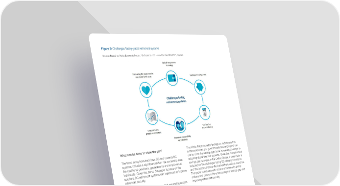Figure 2: Challenges facing global retirement systems Source: Based on World Economic Forum, “We’ll Live to 100 – How Can We Afford It?”, Figure 3 What can be done to close the gap? This White Paper includes findings on techniques that system providers (i.e. governments and employers) can The trend away from traditional DB and towards DC use to close the savings gap, from increasing coverage to systems includes a significant shift in risk ownership from adopting digital financial systems. Given that the retirement the traditional providers, governments and employers to savings gap is largest in the United States, a case study is individuals. Given this trend, this paper focuses on the included on the challenges facing US retirement systems solutions DC retirement systems can implement to improve and the lessons that can be learned from various countries. retirement security. This paper concludes with recommendations for policy- makers and plan providers for closing the savings gap and A key finding in the first paper was that expanding access improving retirement security. to retirement savings vehicles is one of the most effective means to address the global retirement crisis. Without easy access, and in the absence of auto-enrolment or mandates, individuals are less likely to save. While ensuring that individuals have access to the tools needed to plan for retirement is important, effectively engaging them to participate in the first place is critical. In addition, financial innovation is necessary to make sure that savings can be invested in low-cost products that can produce a stable and sufficient retirement income. How We Can Save (for) Our Future 7