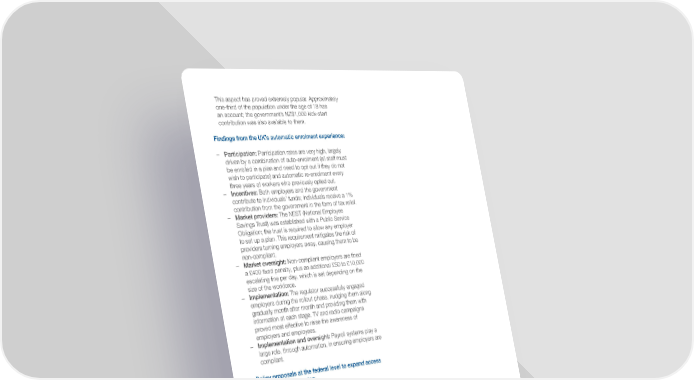 This aspect has proved extremely popular. Approximately one-third of the population under the age of 18 has an account; the government’s NZ$1,000 kick-start contribution was also available to them. Findings from the UK’s automatic enrolment experience: – Participation: Participation rates are very high, largely driven by a combination of auto-enrolment (all staff must be enrolled in a plan and need to opt out if they do not wish to participate) and automatic re-enrolment every three years of workers who previously opted out. – Incentives: Both employers and the government contribute to individuals’ funds; individuals receive a 1% contribution from the government in the form of tax relief. – Market providers: The NEST (National Employee Savings Trust) was established with a Public Service Obligation; the trust is required to allow any employer to set up a plan. This requirement mitigates the risk of providers turning employers away, causing them to be non-compliant. – Market oversight: Non-compliant employers are fined a £400 fixed penalty, plus an additional £50 to £10,000 escalating fine per day, which is set depending on the size of the workforce. – Implementation: The regulator successfully engaged employers during the rollout phase, nudging them along gradually month after month and providing them with information at each stage. TV and radio campaigns proved most effective to raise the awareness of employers and employees. – Implementation and oversight: Payroll systems play a large role, through automation, in ensuring employers are compliant. Policy proposals at the federal level to expand access in the US private sector: – Expand access: Encourage retirement plans for more Americans, facilitated through the workplace – Design specific systems: Ensure legislation captures the overarching objectives but allows individual states the flexibility to design systems that meet their specific needs; clarify the legal status of requiring auto-enrolment through employers and provide flexibility under the Employee Retirement Income Security Act – Increase savings levels: Find ways for employers to contribute and increase annual IRA contribution limits – Increase participation: Encourage auto-enrolment and provide incentives for individuals and employers – Ensure portability: Make it easier for accounts to be portable across employers and states where possible – Maintain simplicity: Design low-cost plans with frictionless processes for employers and employees – Educate and reach out: Educate individuals about the programme to encourage participation and build confidence in the system; connect with and educate employers to ensure they are engaged in the programme, especially in the rollout phase How We Can Save (for) Our Future 21