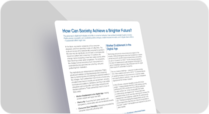How Can Society Achieve a Brighter Future? The advances in digital technologies and shifts in consumer behaviour have profound potential impacts on society. Public-private cooperation can accelerate positive changes, enable inclusive innovation, and mitigate adverse effects – if purposeful efforts begin now. In the future, successful companies will be consumer- Worker Enablement in the obsessed, and their operating models will reflect this. The Digital Age scale and scope of the transformation required to operate in this new way are significant, and will have a commensurate impact on workers and consumers. For workers, the Technology can provide value across every aspect of the change implies navigating a more fluid career journey rather industry. Artificial intelligence alone has the potential to double than following a linear career progression. For consumers, annual economic growth rates and boost labour productivity the change involves becoming much more proactive in 29 by up to 40 percent by 2035. As this change progresses, understanding how providers are collecting, using and the need for employees to work alongside technologies will protecting their information. grow increasingly urgent as many employees lack the digital skills required to undertake this journey. The implications are widespread and complicated. Public- private partnerships can help businesses and consumers This is a massive challenge – consumer industries employ alike by minimizing risks and realizing the potential benefits of 30 19% of the workforce across the OECD. As transformations the changes. Such partnerships must include a diverse array of operating models of consumer-centric industries creates of stakeholders beyond industry and government, including new opportunities for workers, it may also cause widespread individuals and academic institutions, and they must enable displacement for millions of people. disruptors such as education technology companies and freelance platforms. These partnerships need to focus on In this US alone, consumer industries employ 30.5 million three areas: people.31 Analysis indicates that 54% of the activities currently performed by CPG workers and 40% of those performed – Worker Enablement in the Digital Age: Helping by retail workers can, in fact, be automated (for details workers acquire and apply new skills 32 on methodology, see Appendix B). If these tasks were – Flexicurity: Supporting fluid career flexibility with automated today and no new roles were found for workers, this transparency, social safety nets and transferable benefits displacement could effectively double the US unemployment rate.33 Workers are feeling this pressure directly as well: 43% – Consumer Data Principles: Managing and protecting of individuals believe that their job is likely to be automated in consumer data while unlocking value 34 the next 10 years. Similar patterns are expected to play out in other markets. Figure 11: Estimated Impact of Automation on CPG and Retail Industries Workforce in the United States CPG INDUSTRY RETAIL INDUSTRY 9% 4% 4% 2% 2% 4% 4% 20% 14% 10% 34% 30% 28% 17% 13% 48% 44% 43% 39% 39% 41% 44% s 23% 26% s 34% 15% 81% 82% 53% 58% 69% 51% e of job37% 43% 45% 47% e of job46% 47% 48% Shar Shar Time Time 2015 2020 2025 2030 2035 2015 2020 2025 2030 2035 2040 2045 2050 Role-Eliminating Automation Partial Automation “Running with the Machine” Role-Eliminating Automation: More than 75% of activities can be automated Partial Automation: Between 25% and 75% of activities can be automated “Running with the Machine” : Less than 25% of activities can be automated; Running with the Machine considers that workers will reallocate time to more “human-like tasks” and work in a collaborative, fully integrated manner alongside machines Operating Models for the Future of Consumption 19