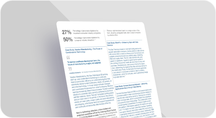 Percentage of processes digitalized by – Obvious, rapid decisions based on a single version of the 27% incumbent consumer industry companies. truth, driven by undisputed facts; time to action is reduced by a factor of ten. Percentage of processes digitalized by 10 50% consumer industry disruptors. Case Study: StitchFix – Enhancing Style with Data Science Case Study: Voodoo Manufacturing – The Power of This San Francisco-based on-demand styling service and Combinatorial Technology apparel subscription company marries predictive data science with human skills to create a virtuous cycle that achieves and sustains consumer relevance by unifying sales, marketing, To borrow a software development term, the R&D and supply chain. The 80+ data scientists link every future of manufacturing is agile, not waterfall. aspect of operations. Algorithms guide human stylists to the clothing choices that clients are most likely to enjoy and purchase. Simultaneously, data science informs the supply chain, determining the logistical flow that optimizes delivery to Jonathan Schwartz – Co-founder of Voodoo Manufacturing the client’s door. Finally, live feedback from clients generates Voodoo Manufacturing, the New York-based 3D printing a vast amount of consumer preference data by clothing start-up, uses combinatorial technology to continually characteristic, which the company uses to predictively design 11 improve production efficiency on a manufacturing floor that its private label line. seamlessly melds human technicians, robots, 3D printers, AI and other technology. In-house design software manages and coordinates the process from order to shipping. Machine Case Study: Farmers Business Network – Unlocking learning increasingly streamlines processes. Voodoo is adding Agribusiness Value through Data Sharing robotics to automate tasks currently performed by technical staff (for instance, robots “harvest” completed printing plates Farmers Business Network (FBN) is a US-based analytics and and put clean ones in the printer). In the future, they believe commerce platform that crowd-sources data from farmers to robots will clean parts, ensure quality and automate packing help farmers make better decisions. Participants contribute and shipping, while human technical support troubleshoots their individual data, which is consolidated into a significant and continually enhances the effectiveness of the line. and powerful base of knowledge. This collaboration allows Next to technology adoption, a data mindset and all participants to benefit from the shared insights across analytical capabilities will be the most significant factors the platform. FBN farmers generate 9% higher corn yields in determining future success: these are the building blocks and 11% higher soy bean yields than average, illustrating for enabling technology and understanding customers and how good data and information enable this community to consumers. While few companies dispute the importance of make better decisions to increase output. Additionally, FBN data, most have not yet gone through the dramatic change offers the first national e-commerce buying system for farm necessary to become truly data-driven organizations. Future inputs, premiums for speciality crops, and access to credit operating models will view and incorporate data as DNA, the programmes. While some farmers are at first hesitant to share fundamental ingredients for the entire organization, governed information with competitors, FBN has expanded primarily by a top-down mandate and actively supported by every through word-of-mouth as farmers realize the benefits to be employee. Serving the core, consumer-obsessed purpose had in terms of profits of the digital farm economy and gain of the company will require significant increases in individual strength in numbers during big agriculture’s era of mega- consumer insight. As the pace of change accelerates, consolidation. dramatically expanded and continually renewed data becomes vital to survival. Data will be the vital factor enabling leaders and Structure: The Fundamental Change in Shape individual employees to make the best decisions at the optimal and Execution within the Operating Model speed. Imperatives for the data-driven organization include: Ecosystem – Top-down mandate, with leadership themselves actively Operating models of the future will be transformed using data, driving its improvement and extending data as structurally, bringing ecosystems to the core of companies’ DNA to every member and structural component of the strategies. Extending far beyond the existing supplier/ organization customer value chain relationships, an ecosystem is the – Exponential insights aided by data science and a real-time network of cross-industry players who work together to data system across every function and role within the company define, build and execute market-creating customer and consumer solutions. An ecosystem is defined by the depth – Centrally facilitated and seamless flow of data across and breadth of potential collaboration among a set of business models, functions and project teams players: each can deliver a piece of the consumer solution, or contribute a necessary capability. 10 Operating Models for the Future of Consumption