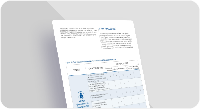 Realization of these principles will require both protocols If Not Now, When? and potential constructs or platforms – (for example, a “data passport”) in which consumers can securely store the data As technology-driven change continues to accelerate, that they explicitly agreed to share with companies across the long-term viability of the economic system depends multiple marketplaces. on thoughtful, collaborative, purposeful and immediate stakeholder action. These specific societal implications are intrinsically linked by a common purpose to drive societies towards digital inclusivity. Stakeholder groups can, and should, actively explore ways to mitigate these societal impacts through both individual and collaborative actions. Figure 14: Calls to Action – Stakeholder Involvement to Achieve a Better Future STAKEHOLDERS THEME CALL TO ACTION Individual Academic Enabling Workers Industry Government Institutions Disruptors Transform academic curricula and culture from focus on X X X X X knowledge and four-year degree to lifelong learning Use data to drive right-skilling that recurrently identifies and X X builds newly required skills; measure the ROI of programmes Address the affordability hurdle X X X Worker of alternative learning Enablement in Couple education/skills the Digital Age programmes with career X X opportunities Enable the “digitally underprivileged” with digital X literacy and infrastructure Reform to tie benefits to the employee rather than company; X X broad-based benefits, including learning accounts Invest in platforms and technology that enable workers Flexicurity to provide a transparent X X X and verified record of their competencies Create comprehensible overview of consumer data collection and X X X usage Deploy control mechanisms, X X X X (e.g. consumer data passport) Consumer Data Principles Define data security requirements X X X and infrastructure Operating Models for the Future of Consumption 23
