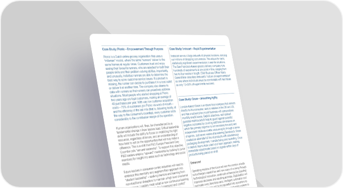 Case Study: Picnic – Empowerment Through Purpose Case Study: Instacart – Rapid Experimentation Picnic is a Dutch online grocery organization that uses a Instacart serves a large network of physical locations, carrying “milkman” model, where the same “runners” deliver to the out millions of shopping occurrences. This allows for rapid, same homes at regular times. Customers trust and enjoy statistically significant experimentation in real-life situations. seeing their favourite runners, who are selected for both their The San Francisco-based grocery delivery company runs people skills and their problem-solving abilities. Importantly, hundreds of experiments at any point in time, ranging from and unusually, individual runners are able to determine the two to four weeks in length. Chief Business Officer Nilam best way to solve customer service issues. If a product is Ganenthiran describes Instacart’s “culture of experimentation” missing, the runner can decide to purchase it in a local outlet as one where individuals must be comfortable with fast failure or deliver it at another time. The company also shares its as only 10–20% of experiments succeed. data with runners so that runners can proactively address situations. Most people who started shopping at Picnic two years ago are loyal customers, making an average of 40 purchases per year. With very low customer acquisition Case Study: Graze – Unleashing Agility costs – 75% of customers join Picnic via word-of-mouth – and the efficiency of the last mile (that is, delivering locally, all London-based Graze is a natural-food company that delivers the way to the consumer’s doorstep), every customer adds directly to the consumer, sells to retailers in the UK and US, considerably to the contribution margin of the operation. and has a subscription model business with personalized, monthly snack boxes. Explicit objectives, well-defined Human organizations will, thus, be characterized by a guardrail metrics (which help to guard against potential fundamental change in how leaders lead. Critical leadership negative outcomes by covering additional dimensions on skills will include the ability to focus on mobilizing the right which the primary objective is not necessary focused) and resources, regardless of tenure, and an understanding of independent initiatives enable unusual agility through a series how best to act on the opportunities that will truly make a of sprints. Just seven weeks after entering Sainsbury’s, Graze difference. This is a shift that P&G Europe President Gary created an alternate full line of products with simultaneous Coombe calls “servant leadership”. To support this objective, packaging development, manufacturing and marketing. Once P&G leaders employ “upward” mentorship by looking to junior in market, teams took a test-and-learn approach, making members for insight into areas such as technology and social immediate adjustments based on signals within days of media. products being placed on shelf. Future leaders in consumer-centric industries will need to Enhanced embrace this mentality and augment their approach into “student leadership” – seeking mentors and learning from Operating models of the future will see the creation of both non-traditional disruptors to maintain a high level of external turbocharged capabilities and new ways of working through awareness. Leaders must adopt a new continuous-learning technological innovation, continually enhanced by data that mindset that contrasts with the “command and control” improves decisions and resulting activities. Digitalization will behaviours that persist in many organizations today. permeate every functional area; intelligent automation and artificial intelligence will be incorporated into operations to Living increase efficiency and accuracy, freeing human workers to drive market growth and efficiency. A hallmark of operating models of the future will be their agility. Only 15% of today’s industry leaders believe their Recent press articles have focused on a dystopian scenario operating models can respond sufficiently quickly to sometimes called the “Terminator” future, one in which robots changing market conditions, while more than 62% of replace humans. Research and in market examples, however, 7 suggest an “Iron Man” future, with technology instead digital disruptors believe their operating models can do so. Living organizations will continually evaluate the external enhancing human abilities, creating “super workers” capable 8 environment and nimbly adjust to changing conditions. They of delivering twice as much as non-augmented peers. will be self-organizing, and their work will be project-based, This will involve a significant shift in mindset and the ongoing with new initiatives forming organically. Teams will act with discovery and use of technology. Technology will no longer resolve and resiliency, prioritizing progress over perfection – a be defined as the provenance of IT. Instead, it will be the “corporate garage” model enabling rapid experimentation responsibility of each business unit and individual employee and the development of “minimum viable products” that they to understand the new opportunities that technology unlocks, test quickly, learning from successes and failures. Teams will and integrate those technologies into their day-to-day also respond to changing market dynamics and innovate activities – an ability that only 33% of current companies claim at a rapid pace, having the will to experiment and the ability 9 to do so. The end goal will be value creation across all to have. At the same time, the role of IT will expand, with a stakeholders. focus on identifying and exercising disruptive technologies, to unlock combinatorial technology that opens new strategic options. As a result, each worker across the organization will embrace technology and every company will become a technolo