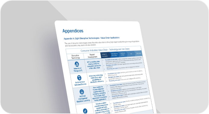 Appendices Appendix A: Eight Disruptive Technologies – Value Chain Applications The use of disruptive technologies across the entire value chain is driving high-impact benefits through a range of applications and has become a key source of value creation. Consumer Industries Value Chain – Technology and Use-Cases Disruptive Recent Design & Manufacture, Distribute Sell After Sales Technology Development Innovation Plan & Buy & Move IOT is enabling data • Foundational use-cases: quality management; storage conditions control; fleet sharing within the management; digital stores; real-time omnichannel marketing; electronic shelf labels; beacons & geolocation; wearables Internet of ecosystem across the • Emerging use-cases: automated replenishment; remote diagnostics;predictive Things (IoT) entire value chain maintenance • Pioneering use-cases: living services; real-time engagement feedback Advancing technology • Foundational use-cases: Self-driving commercial trucks; Last mile delivery; continues to open Self-driving drones possibilities in • Emerging use-cases: Self-driving personal automobiles; Self-driving public Autonomous distribution efficiency transportation (buses, etc..) Vehicles/Drones • Pioneering use-cases: Drone consumer intelligence; Dronevertising New models for • Foundational use-cases: Trend and volume forecasting; Descriptive analytics; ‘Human+Machine’ Chatbots; After-sales service; Robotics Process Automation; Development augmentation are Operations Automation Artificial emerging, extending • Emerging use-cases: Predictive recommendations; Smart Search from supply chain Assistance; Intelligent S&OP planning; Stock allocation forecasting; AI-assisted Intelligence/ operations to customer- merchandising; Dynamic pricing Machine Learning • Pioneering use-cases: Scenario-driven prescriptive analytics; Brain-simulation facing applications ideation; DNA workforce profiling Robotic-enabled manufacturing lowers • Foundational use-cases: Robotics-enabled prototyping; Robotic manufacturing; operational costs, Robotic picking enabling repatriation of • Emerging use-cases: Automated warehouse; Automated sales assistants; manufacturing to bring Automated customer support Robotics production closer to the • Pioneering use-cases: Co-bots; Cognitive robotics; Dark manufacturing; Robotic shopping carts end-consumer Consumer demand for • Foundational use-cases: Product source tracking; inventory replenishment; trust and transparency Supply chain product traceability; Merchandise tracking; Product authenticity Digital Traceability continue to increase mapping; Product warranty The convergence of • Foundational use-cases: Prototyping; In-store product printing; R&D with prototyping Real-time manufacturing and manufacturing is • Emerging use-cases: In-store ‘point-of-sale marketing’ printing; effectively shrinking the In-store customization 3D Printing supply chain • Pioneering use-cases: Real-time inventory production; 3D printed fashion; Custom promotional material; Custom workplace solutions Application of AR/ VR growing to include • Foundational use-cases: Virtual planogramming; Product design; training the workforce Virtual retail locations; AR/VR engagement and facilitating • Emerging use-cases: Virtual changing rooms; Immersive campaigns; Augmented Reality/ Human+Machine Virtual training environments Virtual Reality collaboration in • Pioneering use-cases: Virtual market research, Virtual sourcing; Virtual customer service; Virtual hiring manufacturing New applications • Foundational use-cases: Authenticity verification; Supply-chain verification; emphasize trusted Online wallet; Transaction verification verification of • Emerging use-cases: Employee data verification; Education transcript Blockchain individually held verification; Professional credentials (e.g. legal) verification information • Pioneering use-cases: Smart contracts; Warranty tracking; Shared ledgers Operating Models for the Future of Consumption 25