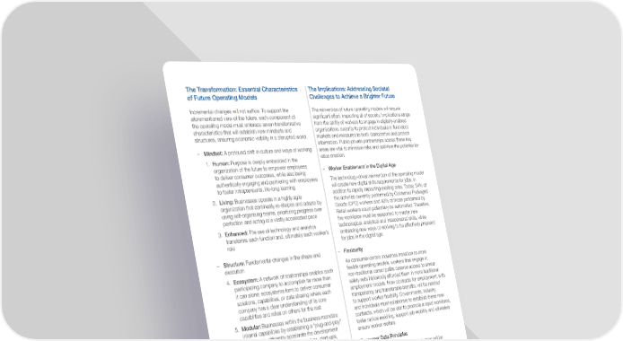 The Transformation: Essential Characteristics The Implications: Addressing Societal of Future Operating Models Challenges to Achieve a Brighter Future Incremental changes will not suffice. To support the The reinvention of future operating models will require aforementioned view of the future, each component of significant effort, impacting all of society. Implications range the operating model must embrace seven transformative from the ability of workers to engage in digitally-enabled characteristics that will establish new mindsets and organizations, security to protect individuals in fluid labor structures, ensuring economic viability in a disrupted world. markets and measures to both democratize and protect information. Public-private partnerships across these key – Mindset: A profound shift in culture and ways of working areas are vital to minimize risks and optimize the potential for 1. Human: Purpose is deeply embedded in the value creation. organization of the future to empower employees – Worker Enablement in the Digital Age to deliver consumer outcomes, while also being authentically engaging and partnering with employees The technology-driven reinvention of the operating model to foster intrapreneurial, life-long learning will create new digital skills requirements for jobs, in 2. Living: Businesses operate in a highly agile addition to rapidly impacting existing roles. Today, 54% of organization that continually re-shapes and adapts by the activities currently performed by Consumer Packaged using self-organising teams, prioritizing progress over Goods (CPG) workers and 40% of those performed by perfection and acting at a vastly accelerated pace Retail workers could potentially be automated. Therefore, the workforce must be supported to master new 3. Enhanced: The use of technology and analytics technological, analytical and interpersonal skills, while transforms each function and, ultimately each worker’s embracing new ways of working to be effectively prepared role for jobs in the digital age. – Structure: Fundamental changes in the shape and – Flexicurity execution As consumer-centric industries transition to more 4. Ecosystem: A network of relationships enables each flexible operating models, workers that engage in participating company to accomplish far more than non-traditional career paths deserve access to similar it can alone; ecosystems form to deliver consumer safety nets historically afforded them in more traditional solutions, capabilities, or data sharing where each employment models. New contracts for employment, with company has a clear understanding of its core transparency and transferable benefits, will be needed capabilities and relies on others for the rest to support worker flexibility. Governments, industry 5. Modular: Businesses within the business monetize and individuals must collaborate to establish these new internal capabilities by establishing a “plug-and-play” contracts, which will be vital to promote a liquid workforce, structure to efficiently accelerate the development foster radical reskilling, support job mobility and ultimately and integration of new business ideas, start-ups, ensure worker welfare. acquisitions and outside capabilities – Consumer Data Principles 6. Liquid: Companies source and manage their The success of consumer-centric industries will be workforces by accessing the best talent at the right predicated on the exponentially increasing use of consumer time to meet demand through employment models data. Recent surveys find that 57% of consumers are that include permanent employees, company affiliates, concerned with how businesses use their information, with partners, publicly available talent and consumers 41% of consumers feeling they need greater transparency into companies to have confidence in their products/ – Economic Viability: Responsibility to generate lasting services. To build long term trust, the industry must carefully performance and sustainable impact protect the privacy and security of consumers’ data and be 7. Enduring: The holistic application of the other six transparent about how they are utilizing it. characteristics and focus on achieving sustainable, In conclusion, the decade ahead will fuel the acceleration profitable growth that is aligned to societal values and of technology-driven change which can lead to the creation establishing lasting trust and transparency of significant value for consumers, workers and the enterprise. As operating models transform to enable these new opportunities for growth, there is the potential for both positive and negative impacts on society. To ensure an inclusive society, key stakeholders must work together in focused collaboration to proactively manage this disruption to achieve a brighter future. Operating Models for the Future of Consumption 5