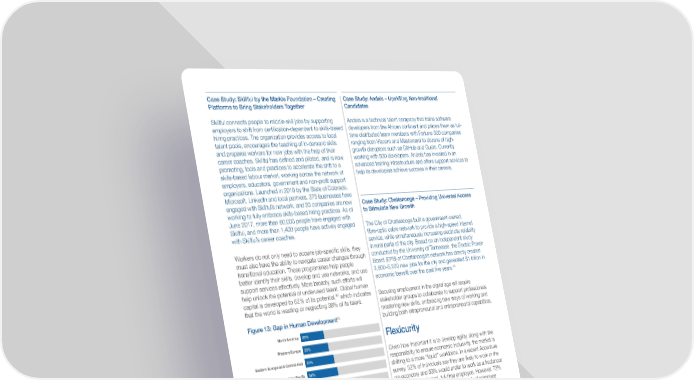 Case Study: Skillful by the Markle Foundation – Creating Case Study: Andela – Upskilling Non-traditional Platforms to Bring Stakeholders Together Candidates Skillful connects people to middle-skill jobs by supporting Andela is a technical talent company that trains software employers to shift from certification-dependent to skills-based developers from the African continent and places them as full- hiring practices. The organization provides access to local time distributed team members with Fortune 500 companies talent pools, encourages the teaching of in-demand skills ranging from Viacom and Mastercard to dozens of high- and prepares workers for new jobs with the help of their growth disruptors such as GitHub and Gusto. Currently career coaches. Skillful has defined and piloted, and is now working with 500 developers, Andela has invested in an promoting, tools and practices to accelerate the shift to a advanced training infrastructure and offers support services to skills-based labour market, working across the network of help its developers achieve success in their careers. employers, educators, government and non-profit support organizations. Launched in 2016 by the State of Colorado, Microsoft, LinkedIn and local partners, 375 businesses have engaged with Skillful’s network, and 20 companies are now Case Study: Chattanooga – Providing Universal Access working to fully embrace skills-based hiring practices. As of to Stimulate New Growth June 2017, more than 60,000 people have engaged with Skillful, and more than 1,400 people have actively engaged The City of Chattanooga built a government-owned, with Skillful’s career coaches. fibre-optic cable network to provide a high-speed internet service, while simultaneously increasing electricity reliability Workers do not only need to acquire job-specific skills, they in rural parts of the city. Based on an independent study must also have the ability to navigate career changes through conducted by the University of Tennessee, the Electric Power transitional education. These programmes help people Board (EPB) of Chattanooga’s network has directly created better identify their skills, develop and use networks, and use 2,800–5,200 new jobs for the city and generated $1 billion in 40 support services effectively. More broadly, such efforts will economic benefit over the past five years. help unlock the potential of underused talent. Global human 39 capital is developed to 62% of its potential, which indicates Securing employment in the digital age will require that the world is wasting or neglecting 38% of its talent. stakeholder groups to collaborate to support professionals mastering new skills, embracing new ways of working and 40 Figure 13: Gap in Human Development building both intrapreneurial and entrepreneurial capabilities. North America 26% Flexicurity Western Europe 29% Eastern Europe and Central Asia 33% Given how important it is to develop agility, along with the responsibility to ensure economic inclusivity, the market is East Asia and the Pacific 34% shifting to a more “liquid” workforce. In a recent Accenture survey, 52% of individuals say they are likely to work in the Global Average 38% gig economy and 53% would prefer to work as a freelancer Latin America and the Caribbean 40% rather than as a formal, full-time employee. However, 72% expressed worry about a freelancer’s lack of employee Middle East and North Africa 44% 43 benefits. Legacy support structures for labour markets South Asia 46% have not kept pace with the development of new workforce models. As such, these legacy structures threaten the welfare Sub-Saharan Africa 47% of workers, who stand to lose the benefits of permanent employment, and will restrict the willingness of many workers to find new roles that could be more lucrative and fulfilling. All too often, however, human potential is not realized, A new contract for employment is vital not only for worker held back either by inequality or an unrealistic and welfare but to promote a liquid workforce and support job outdated faith on the part of policy-makers that mobility. Flexicurity ties benefits (e.g. pensions and healthcare) investment in small subsections of highly skilled to the individual and enables talent mobility with portable labour alone can drive sustainable, inclusive growth. skills transcripts, helping workers maximize their long-term economic opportunity. This support structure reduces friction in the labour market, enabling optimal matching of supply and demand of talent. 41 Klaus Schwab – Executive Chairman of the World Economic Forum In this digital age, skill development requires continuous learning on a global scale. This creates opportunities to develop hard technical skills, provides basic digital literacy to populations who lack it and enables individuals through infrastructure to achieve digital inclusion. Operating Models for the Future of Consumption 21