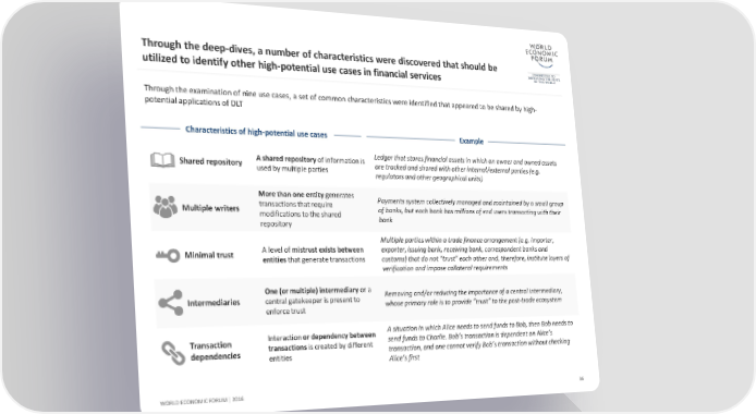 Through the deep-dives, a number of characteristics were discovered that should be utilized to identify other high-potential use cases in financial services Through the examination of nine use cases, a set of common characteristics were identified that appeared to be shared by high- potential applications of DLT Characteristics of high-potential use cases Example A shared repository of information is Ledger that stores financial assets in which an owner and owned assets Shared repository used by multiple parties are tracked and shared with other internal/external parties (e.g. regulators and other geographical units) More than one entity generates Payments system collectively managed and maintained by a small group Multiple writers transactions that require of banks, but each bank has millions of end users transacting with their modifications to the shared bank repository Multiple parties within a trade finance arrangement (e.g. importer, Minimal trust A level of mistrust exists between exporter, issuing bank, receiving bank, correspondent banks and entities that generate transactions customs) that do not “trust” each other and, therefore, institute layers of verification and impose collateral requirements One (or multiple) intermediary or a Removing and/or reducing the importance of a central intermediary, Intermediaries central gatekeeper is present to whose primary role is to provide “trust” to the post-trade ecosystem enforce trust Interactionor dependency between A situation in which Alice needs to send funds to Bob, then Bob needs to Transaction transactions is created by different send funds to Charlie. Bob’s transaction is dependent on Alice’s dependencies entities transaction, and one cannot verify Bob’s transaction without checking Alice’s first WORLD ECONOMIC FORUM | 2016 36