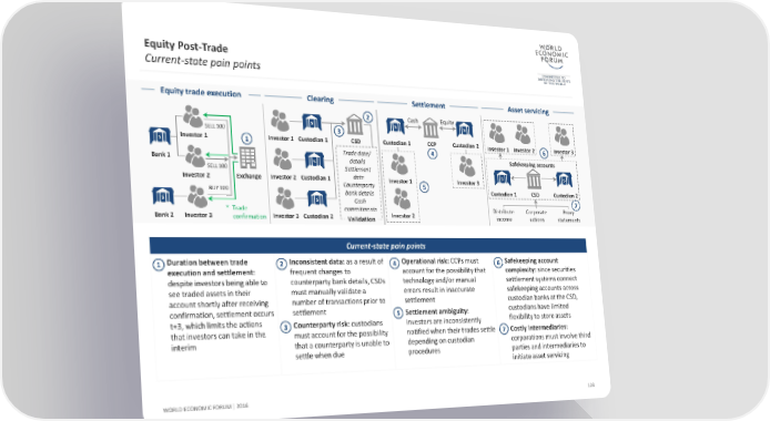 Equity Post-Trade Current-state pain points Equity trade execution Clearing Settlement Asset servicing 2 Cash Equity SELL 100 3 Investor 1 1 Investor 1 Custodian 1 CSD Custodian 1 CCP Custodian 2 Investor 1 Investor 2 6 Investor 3 Trade date/ 4 Bank 1 details Safekeeping accounts SELL 100 Settlement Investor 2 Exchange Investor 2 Custodian 1 date Investor 1 Investor 3 BUY 100 Counterparty 5 Custodian 1 CSD Custodian 2 bank details Cash 7 * Trade commitments Investor 2 Distribute Corporate Proxy Bank 2 Investor 3 confirmation Investor 3 Custodian 2 Validation income actions statements Current-state pain points 1 Duration between trade 2 Inconsistent data: as a result of 4 Operational risk: CCPsmust 6 Safekeeping account execution and settlement: frequent changes to account for the possibility that complexity: since securities despite investors being able to counterparty bank details, CSDs technology and/or manual settlement systems connect see traded assets in their must manually validate a errors result in inaccurate safekeeping accounts across account shortly after receiving number of transactions prior to settlement custodian banks at the CSD, confirmation, settlement occurs settlement 5 Settlement ambiguity: custodians have limited t+3, which limits the actions 3 Counterpartyrisk: custodians investors are inconsistently flexibility to store assets that investors can take in the must account for the possibility notified when their trades settle 7 Costly intermediaries: interim that a counterparty is unable to depending on custodian corporations must involve third settle when due procedures parties and intermediaries to initiate asset servicing WORLD ECONOMIC FORUM | 2016 123