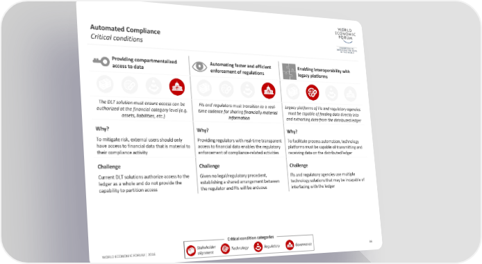 Automated Compliance Critical conditions Providing compartmentalized Automatingfaster and efficient Enabling interoperability with access to data enforcement of regulations legacy platforms The DLT solution must ensure access can be FIs and regulators must transition to a real- Legacy platforms of FIs and regulatory agencies authorized at the financial category level (e.g. time cadence for sharing financially material must be capable of feeding data directly into assets, liabilities, etc.) information and extracting data from the distributed ledger Why? Why? Why? To mitigate risk, external users should only Providing regulators with real-time transparent To facilitate process automation, technology have access to financial data that is material to access to financial data enables the regulatory platforms must be capable of transmitting and their compliance activity enforcement of compliance-related activities receiving data on the distributed ledger Challenge Challenge Challenge Current DLT solutions authorize access to the Given no legal/regulatory precedent, FIs and regulatory agencies use multiple ledger as a whole and do not provide the establishing a shared arrangement between technology solutions that may be incapable of capability to partition access the regulator and FIs will be arduous interfacing with the ledger Critical condition categories WORLD ECONOMIC FORUM | 2016 Stakeholder Technology Regulatory Governance 99 alignment