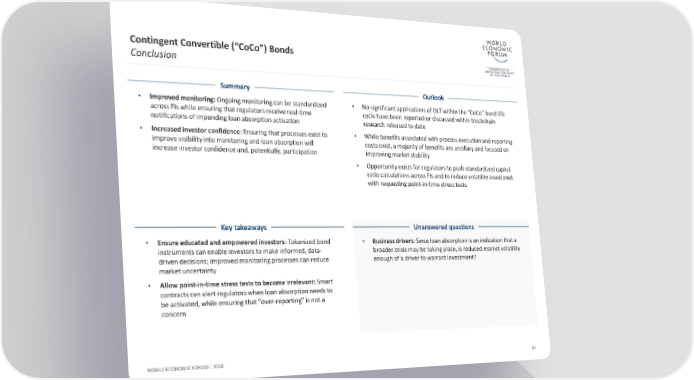Contingent Convertible (“CoCo”) Bonds Conclusion Summary Outlook • Improved monitoring: Ongoing monitoring can be standardized • No significant applications of DLT within the “CoCo” bond life across FIs while ensuring that regulators receive real-time cycle have been reported or discussed within blockchain notifications of impending loan absorption activation researchreleased to date • Increased investor confidence: Ensuring that processes exist to • While benefits associated with process execution and reporting improve visibility into monitoring and loan absorption will costs exist, a majority of benefits are ancillary and focused on increase investor confidence and, potentially, participation improving market stability • Opportunity exists for regulators to push standardized capital ratio calculations across FIs and to reduce volatility associated with requesting point-in-time stress tests Key takeaways Unanswered questions • Ensure educated and empowered investors: Tokenized bond • Business drivers:Since loan absorption is an indication that a instruments can enable investors to make informed, data- broader crisis may be taking place, is reduced market volatility driven decisions; improved monitoring processes can reduce enough of a driver to warrant investment? market uncertainty • Allow point-in-time stress tests to become irrelevant: Smart contracts can alert regulators when loan absorption needs to be activated, while ensuring that “over-reporting” is not a concern WORLD ECONOMIC FORUM | 2016 91
