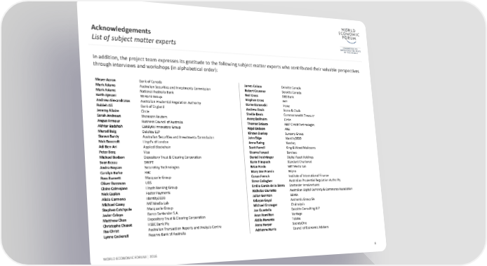 Acknowledgements List of subject matter experts In addition, the project team expresses its gratitude to the following subject matter experts who contributed their valuable perspectives through interviews and workshops (in alphabetical order): Meyer Aaron Bank of Canada James Colaco Deloitte Canada Mark Adams Australian Securities and Investments Commission Robert Cranmer Deloitte Canada Mark Adams National Australia Bank Neil Cross DBS Bank Keith Ajmani TD Bank Group Stephen Cross Aon Andrew Alexandratos Australian Prudential Regulation Authority Dame Damevski inpay Robleh Ali Bank of England Andrew Davis Stone & Chalk Jeremy Allaire Circle Shellie Davis Commonwealth Treasury Sarah Andrews Thomson Reuters Avery Dellheim Circle Angus Armour Business Council of Australia Thomas DeLuca AMP Credit Technologies Akhtar Badshah Catalytic Innovators Group Nigel Dobson ANZ Murad Baig Deloitte LLP Kirsten Dunlop Suncorp Group Steven Bardy Australian Securities and Investments Commission John Edge Identity2020 Nick Beecroft Lloyd's of London Anna Ewing Nasdaq Adi Ben-Ari Applied Blockchain Scott Farrell King & Wood Mallesons Peter Berg Visa Usama Fayyad Barclays Michael Bodson Depository Trust & Clearing Corporation Daniel Feichtinger Digital Asset Holdings Sven Bossu SWIFT Karin Flinspach Standard Chartered Andre Boysen SecureKey Technologies Brian Forde MIT Media Lab Carolyn Burke RBC Mary Ann Francis Wipro Ross Burnett Macquarie Group Conan French Institute of International Finance Oliver Bussman UBS Steve Gallagher Australian Prudential Regulation Authority Claire Calmejane Lloyds Banking Group Emilio Garcia de la Sierra Santander InnoVentures Nick Caplan Faster Payments Nicholas Giurietto Australian Digital Currency & Commerce Association Alicia Carmona Identity2020 Julian Gorman GSMA Michael Casey MIT Media Lab Udayan Goyal Anthemis Group SA Stephen Catchpole Macquarie Group Michael Gronager Chainalysis Javier Celaya Banco Santander S.A. Joe Guastella Deloitte Consulting LLP Matthew Chan Depository Trust & Clearing Corporation Aran Hamilton Vantage Christophe Chazot HSBC Bank Plc Aldila Hananto Telstra Ilsa Christ Australian Transaction Reports and Analysis Centre Anna Harper SocietyOne Lynne Cockerell Reserve Bank of Australia Adrienne Harris Council of Economic Advisers WORLD ECONOMIC FORUM | 2016 8