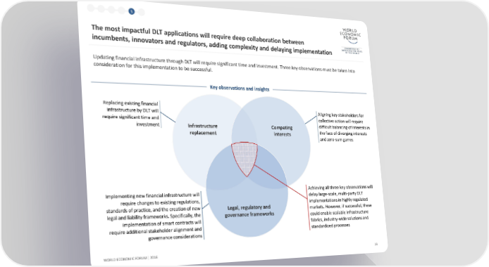 1 2 3 4 5 6 The most impactful DLT applications will require deep collaboration between incumbents, innovators and regulators, adding complexity and delaying implementation Updating financial infrastructure through DLT will require significant time and investment. Three key observations must be taken into consideration for this implementation to be successful. Key observations and insights Replacing existing financial infrastructure by DLT will Aligning key stakeholders for require significant time and collective action will require investment Infrastructure Competing difficult balancing of interests in replacement interests the face of diverging interests and zero-sum games Implementingnew financialinfrastructure will Achieving all three key observations will require changes to existing regulations, delay large-scale, multi-party DLT standards of practice, and the creation of new Legal, regulatory and implementations in highly regulated legal and liability frameworks. Specifically, the governance frameworks markets. However, if successful, these implementation of smart contracts will could enable scalable infrastructure require additional stakeholder alignment and fabrics, industry-wide solutions and governance considerations standardized processes WORLD ECONOMIC FORUM | 2016 23