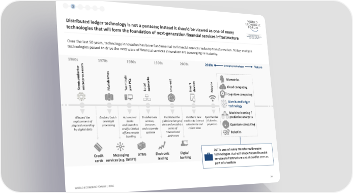 1 2 3 4 5 6 Distributed ledger technology is not a panacea; instead it should be viewed as one of many technologies that will form the foundation of next-generation financial services infrastructure Over the last 50 years, technology innovation has been fundamental to financial services industry transformation. Today, multiple technologies poised to drive the next wave of financial services innovation are converging in maturity. 1960s s 1970s 1980s 1990s 2000s 2010s Emerging technologies future rto sor cdu ces ls no pro na s rks t s e Biometrics cmi cro ainframes rmid PC cal two vice obil Cloud computing eS mi M Te an Lo ne Interne Smartde M Cognitive computing Distributed ledger technology Machine learning / Allowed the Enabled batch Automated Enabled data Facilitated the Created a new Spearheaded predictive analytics replacement of overnight banks centres, global exchange of medium to interact frictionless physical recording processing and branches intranets data and enabled a with clients and payments Quantum computing by digital data and facilitated and corporate series of collect data offline remote systems international Robotics banking businesses Credit Messaging ATMs Electronic Digital DLT is one of many transformative new cards services (e.g. SWIFT) trading banking technologiesthat will shape future financial services infrastructure and should be seen as part of a toolbox WORLD ECONOMIC FORUM | 2016 20