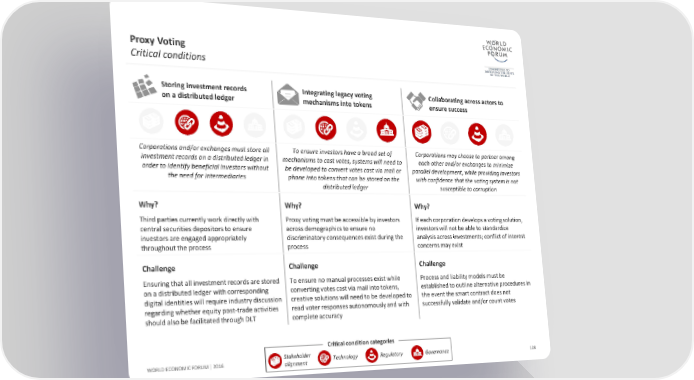 Proxy Voting Critical conditions Storing investment records Integrating legacy voting Collaborating across actors to on a distributed ledger mechanisms into tokens ensure success Corporations and/or exchanges must store all To ensure investors have a broad set of Corporations may choose to partner among investment records on a distributed ledger in mechanisms to cast votes, systems will need to each other and/or exchanges to minimize order to identify beneficial investors without be developed to convert votes cast via mail or parallel development, while providing investors the need for intermediaries phone into tokens that can be stored on the with confidence that the voting system is not distributed ledger susceptible to corruption Why? Why? Why? Third parties currently work directly with Proxy voting must be accessible by investors If each corporation develops a voting solution, central securities depositors to ensure across demographics to ensure no investors will not be able to standardize investors are engaged appropriately discriminatory consequences exist during the analysis across investments; conflict of interest throughout the process process concerns may exist Challenge Challenge Challenge Ensuring that all investment records are stored To ensure no manual processes exist while Process and liability models must be on a distributed ledger with corresponding converting votes cast via mail into tokens, established to outline alternative procedures in digital identities will require industry discussion creative solutions will need to be developed to the event the smart contract does not regarding whether equity post-trade activities read voter responses autonomously and with successfully validate and/or count votes should also be facilitated through DLT complete accuracy Critical condition categories WORLD ECONOMIC FORUM | 2016 Stakeholder Technology Regulatory Governance 108 alignment