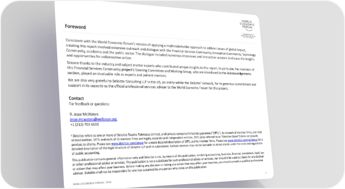 Foreword Consistent with the World Economic Forum’s mission of applying a multistakeholderapproach to address issues of global impact, creating this report involved extensive outreach and dialogue with the Financial Services Community, Innovation Community, Technology Community, academia and the public sector. The dialogue included numerous interviews and interactive sessions to discuss the insights and opportunities for collaborative action. Sincere thanks to the industry and subject matter experts who contributed unique insights to this report. In particular, the members of this Financial Services Community project’s Steering Committee and Working Group, who are introduced in the Acknowledgements section, played an invaluable role as experts and patient mentors. We are also very grateful to Deloitte Consulting LLP in the US, an entity within the Deloitte1 network, for its generous commitment and support in its capacity as the official professional services adviser to the World Economic Forum for this project. Contact For feedback or questions: R. Jesse McWaters jesse.mcwaters@weforum.org +1 (212) 703 6633 1 Deloitte refers to one or more of Deloitte Touche Tohmatsu Limited, a UK private company limited by guarantee (“DTTL”), its network of member firms, and their related entities. DTTL and each of its member firms are legally separate and independent entities. DTTL (also referred to as “Deloitte Global”) does not provide services to clients. Please see www.deloitte.com/about for a more detailed description of DTTL and its member firms. Please see www.deloitte.com/us/about for a detailed description of the legal structure of Deloitte LLP and its subsidiaries. Certain services may not be available to attest clients under the rules and regulations of public accounting. This publication contains general information only and Deloitte is not, by means of this publication, rendering accounting, business, financial, investment, legal, tax, or other professional advice or services. This publication is not a substitute for such professional advice or services, nor should it be used as a basis for any decision or action that may affect your business. Before making any decision or taking any action that may affect your business, you should consult a qualified professional advisor. Deloitte shall not be responsible for any loss sustained by any person who relies on this publication. WORLD ECONOMIC FORUM | 2016 2