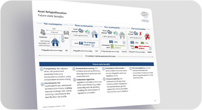 Asset Rehypothecation Future-state benefits Two counterparties Three counterparties Four counterparties Five counterparties Cash Smart Smart Smart contract 3 contract 5 contract ✘ Collateral < 140% regulatory limit < 140% regulatory limit < 140% regulatory limit ✘ Customer 1 Bank Each section 2 75% of obtained : 75% 6 : 75% : 75% represents ¼ of Bank collateral 4 Investment 75% of obtained Hedge 100% of obtained collateral value bank collateral fund collateral 7 Rehypothecation percentage: 0% Rehypothecation percentage: 75% Rehypothecation percentage: 131.25% Rehypothecation percentage: 187.5% The customer maintains possession of the home Future-state benefits 1 Transparency: thecollateral 3 Automated processing: DLT 5 Automated enforcement: a 7 Disintermediation: a smart value, risk position and increases processingefficiency, smart contract ensures assets contract facilitates the ownershiphistory are reducing manual processes and are not rehypothecated over movement of funds and assets, transparent to investors, aiding associated costs regulatory limits eliminating the need for costly in investment decision-making 4 Embedded regulation: 6 Financialstability: the intermediaries 2 Counterparty risk: regulators maintain a clear view enforcement of regulatory counterparties are rated based of the asset history (e.g. value, controls and the transparent on transaction history, enabling ownership and risk position), transaction history greatly investors to hedge their risk by enabling the enforcement of reduce the risk of systematic selecting a counterparty that regulatory constraints failure in the event of default best fits their risk profile WORLD ECONOMIC FORUM | 2016 116