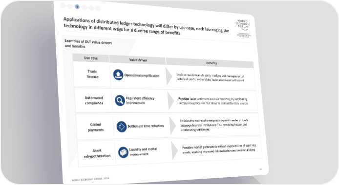 1 2 3 4 5 6 Applications of distributed ledger technology will differ by use case, each leveraging the technology in different ways for a diverse range of benefits Examples of DLT value drivers and benefits Use case Value driver Benefits Trade Operational simplification Enables real-time multi-party tracking and management of finance letters of credit, and enables faster automated settlement Automated Regulatory efficiency Provides faster and more accurate reporting by automating compliance improvement compliance processes that draw on immutable data sources Global Enables the near real-time point-to-point transfer of funds payments Settlement time reduction between financial institutions (FIs), removing friction and accelerating settlement Asset Liquidity and capital Provides market participants with an improved line of sight into rehypothecation improvement assets, enabling improved risk evaluation and decision-making WORLD ECONOMIC FORUM | 2016 21