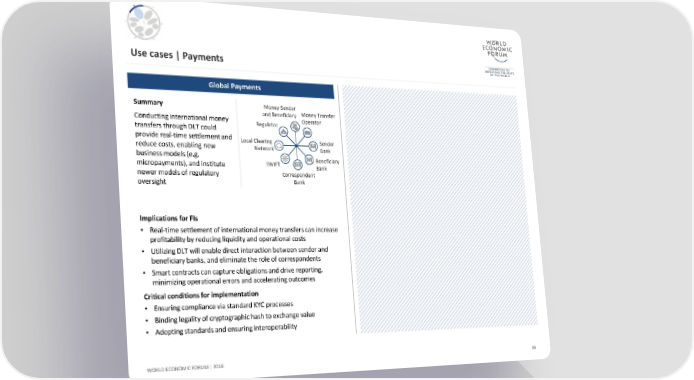 Use cases | Payments Global Payments Summary Money Sender and Beneficiary Money Transfer Conducting international money Regulator Operator transfers through DLT could provide real-time settlement and Local Clearing Sender reduce costs, enabling new Network Bank business models (e.g. Beneficiary micropayments), and institute SWIFT Bank newer models of regulatory Correspondent oversight Bank Implications for FIs • Real-time settlement of international money transfers can increase profitability by reducing liquidity and operational costs • Utilizing DLT will enable direct interaction between sender and beneficiary banks, and eliminate the role of correspondents • Smart contracts can capture obligations and drive reporting, minimizing operational errors and accelerating outcomes Critical conditions for implementation • Ensuring compliance via standard KYC processes • Binding legality of cryptographic hash to exchange value • Adopting standards and ensuring interoperability WORLD ECONOMIC FORUM | 2016 39