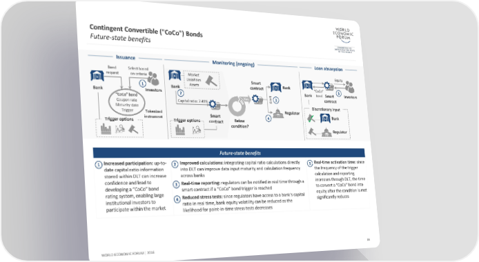 Contingent Convertible ("CoCo") Bonds Future-state benefits Issuance Monitoring (ongoing) Loan absorption Bond Select based Market Equity request on criteria Liabilities Smart 1 Assets contract Bank Bank “CoCo” 5 Bank Investors 2 rt Bank bond Smart Investors “CoCo” bond Capital ratio: 7.49% Yes Ale3 contract Coupon rate Discretionary input Maturity date Regulator Trigger Tokenized Smart Bank instrument 4 Trigger options Trigger options contract Below condition? Regulator Future-state benefits 1 Increased participation: up-to- 2 Improved calculations: integrating capital ratio calculations directly 5 Real-time activation time: since date capital ratio information into DLT can improve data input maturity and calculation frequency the frequency of the trigger stored within DLT can increase across banks calculation and reporting confidence and lead to 3 Real-time reporting: regulators can be notified in real time through a increases through DLT, the time developing a “CoCo” bond to convert a “CoCo” bond into rating system, enabling large smart contract if a “CoCo” bond trigger is reached equity after the condition is met institutional investors to 4 Reduced stress tests: since regulators have access to a bank’s capital significantly reduces participate within the market ratio in real time, bank equity volatility can be reduced as the likelihood for point-in-time stress tests decreases WORLD ECONOMIC FORUM | 2016 89